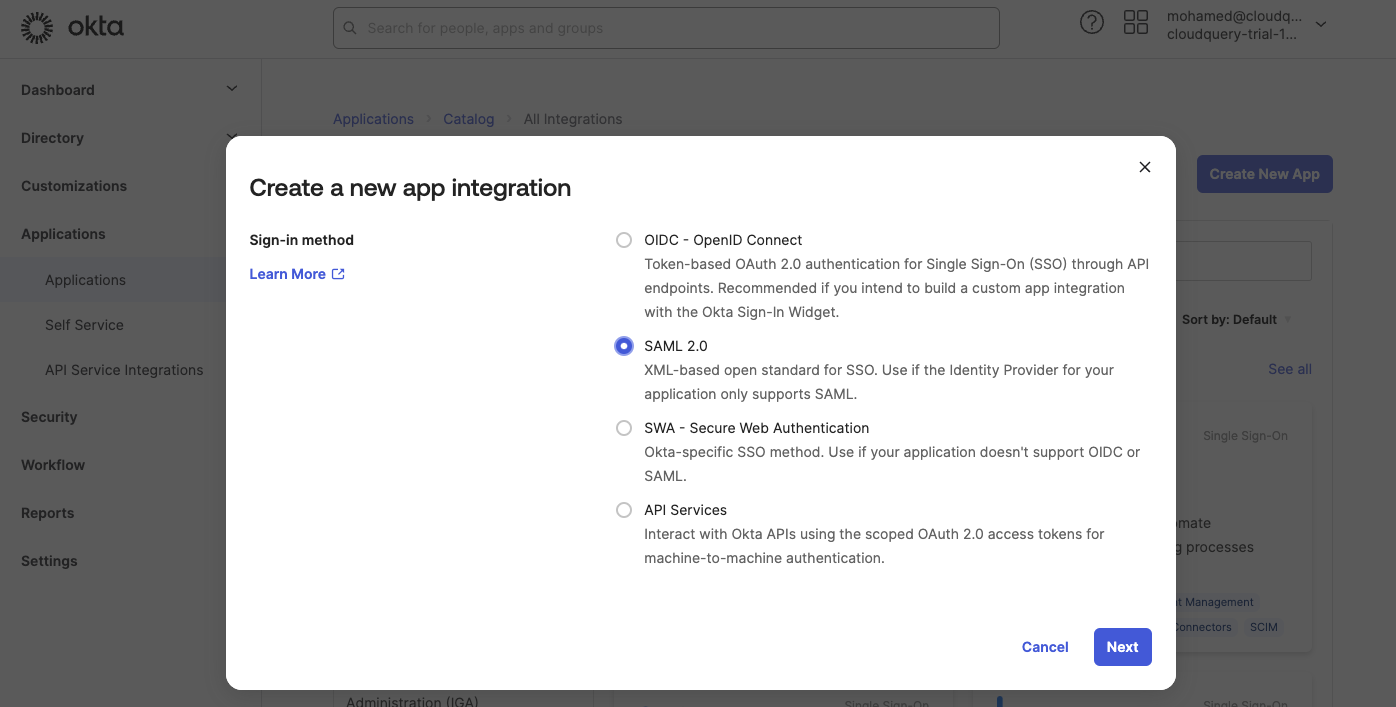 Step 2: Create a SAML Application in Okta