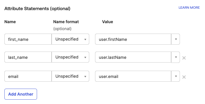 Scroll down to Attribute Statements and add the following: