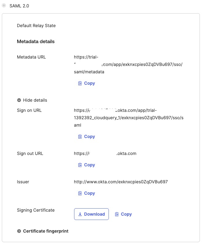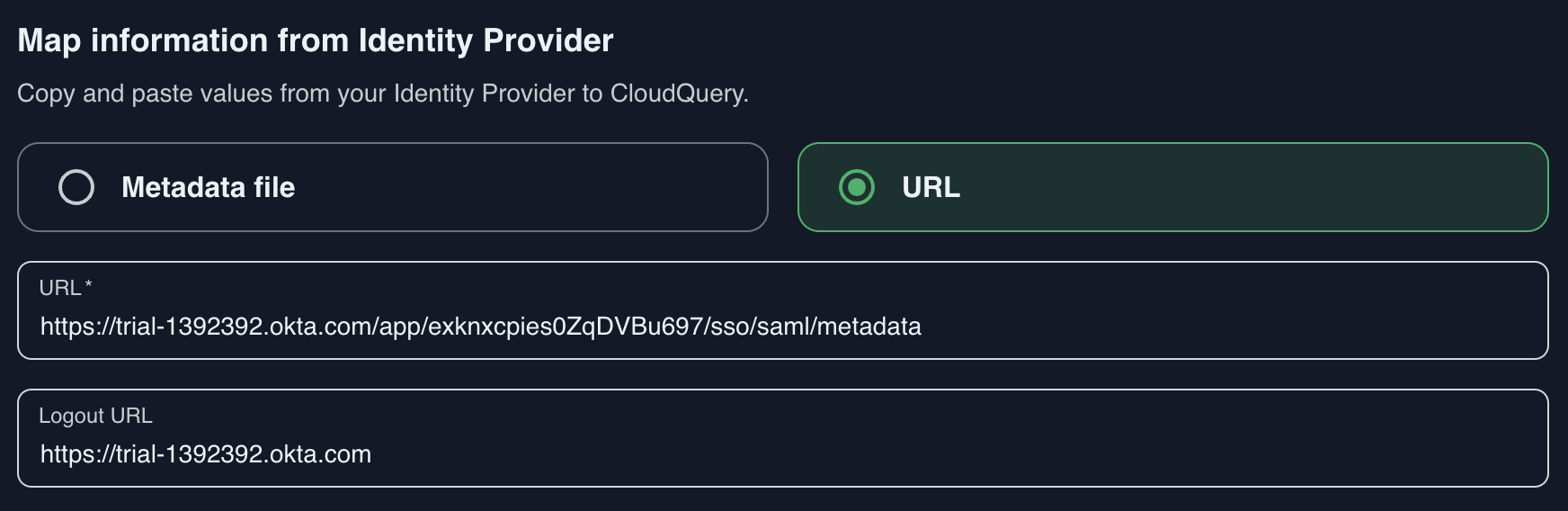 Once done, head back to the CloudQuery Admin panel, enter the Metadata URL instead of uploading an XML file. Then, locate the Sign-Out URL in Okta and copy it.